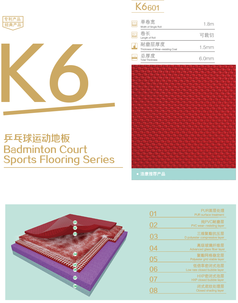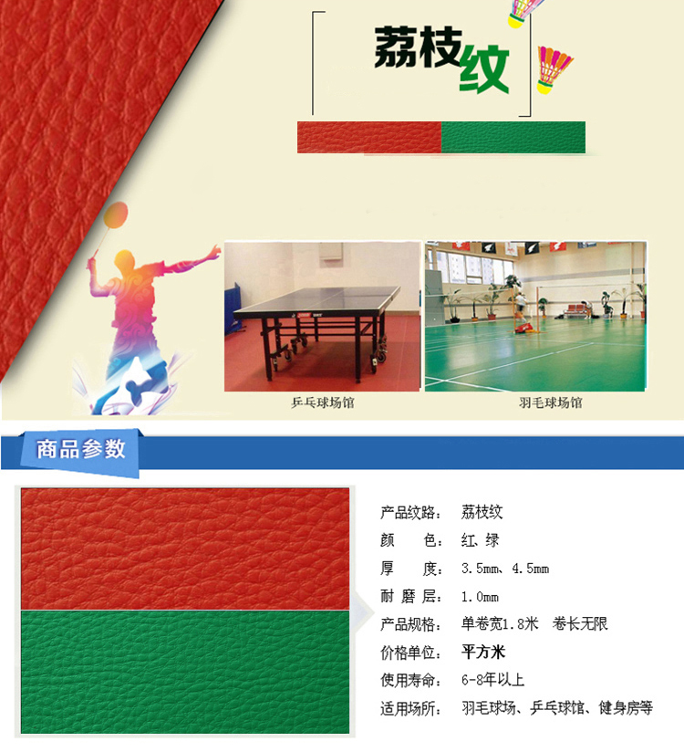 但是比赛用场地一般使用6MM或7MM枣红色PVC地胶