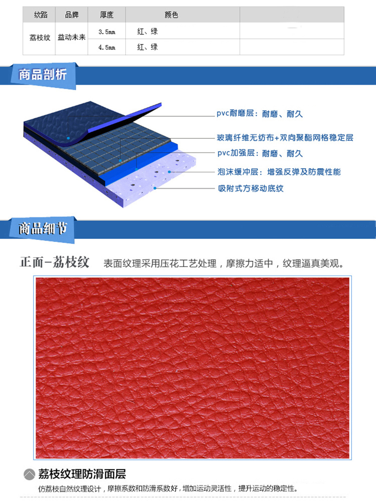 布纹运动地板专门为乒乓球开发的一款产品,布纹地板分红色与蓝色两种,厚度覆盖范围较广有3.8mm、4.3mm 、4.5mm、