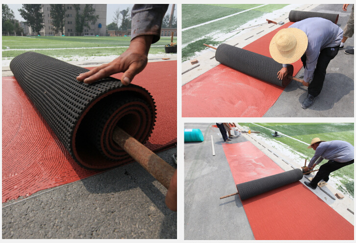 抗紫外线,有效避免运动伤害,具有强韧的弹性层及缓冲层,可抗钉鞋磨损,软硬适中,耐磨性佳,价格较低,有一定的使用局限性,性能介于混合型、透气型之间。在钢筋混凝土基础上铺装最佳。颜色有铁红、草绿色或根据用户需求而定。